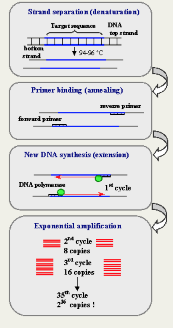 During the INITIAL STEP, the DNA is heated to 95*C in order to begin the denaturing process. During the DENATURE step, DNA is heated even further in order to separate the double strands of DNA. The heat causes the hydrogen bonds within DNA to break, releasing the two strands. During the ANNEAL step, the temperature is lowered in order to allow the primers to adhere to the now single strands of DNA. During the EXTEND step, the temperature is increased slightly. At this temperature, the polymerase then begins working with the primers in order to begin to create complimentary strands of DNA. The FINAL STEP is to ensure that all complementary nucleotides have been attached to the complimentary strand. The FINAL HOLD is used for an indefinite period of time in order to maintain the complimentary strands of DNA until it is time for the strands to be used. Adenine (A) bonds to Thymine (T)