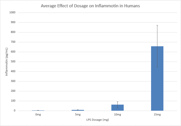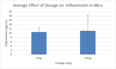 Summary/DiscussionThe human trials showed that there was a significant difference between the groups of different dosages. This information leads to the conclusion that the dosage of LPS has a direct effect on the amount of inflammotin, as the dosage goes up so does inflammation. However, that was not the case with the rats. Although there was a small increase in inflammotin with an increase in dosage, it was not enough to be considered significantly different. The rat trials could have lacked significant difference bacasue rats do not react to the drug in the same way that humans do. | ||||||||||||||||||||||||||||||||||||||