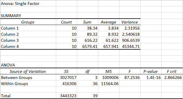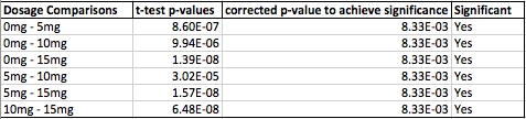 AnalysisFor the human trials there were more than 2 groups, which called for the ANOVA test. Once the ANOVA test resulted in a p-value less than 0.05, as shown in table A, it was determined that there was a significant differentce betweent the groups. Now, in order to compare the 4 groups by pairs, t-tests were used for 6 different comparisons, as shown in table B. Because there is an error involved with multiple comparisons, the Bonferroni correction was used to adjust the p-value that the t-test values must be less than for there to be a significant difference. In this case, there were 6 total comparisons and so the normal p-value was divided by 6, (0.05/6), to get the value 8.33E-03. Each t-test value was less than 8.33E-03 and so there was a significance with each comparison, as shown in table B.