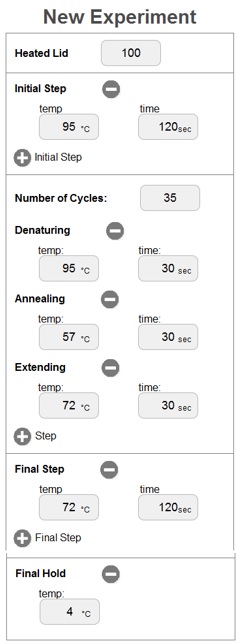 The initial step of thermal cycling requires the DNA sample to be heated to 95°C for two minutes. This initial cycle at high temperature serves to unwind the DNA sequence in preparation for step two. Next, the DNA must be denatured at 95°C for thirty seconds resulting in two single-sided strands of DNA. The DNA must then anneal at 57°C for thirty seconds. In this step, the primers bind to their complimentary base pairs on the DNA, completely surrounding the target sequence to be copied. After annealing, the DNA must extend for thirty seconds at 72°C. The taq polymerase binds to the primer locations and extends the second strand of DNA until it has reached the end of the original target DNA strand. This process of denaturing, annealing, and extending is repeated for a total of 35 cycles. This allows for production of millions of copies of the target DNA. The final step involves a two minute hold at 72°C. This extra time is to ensure that there are no single strands of DNA remaining. Lastly, a final hold at 4°C is done so the new DNA segments can be stored temporarily. The lower temperatures are used so that the new DNA segments do not begin to separate again.