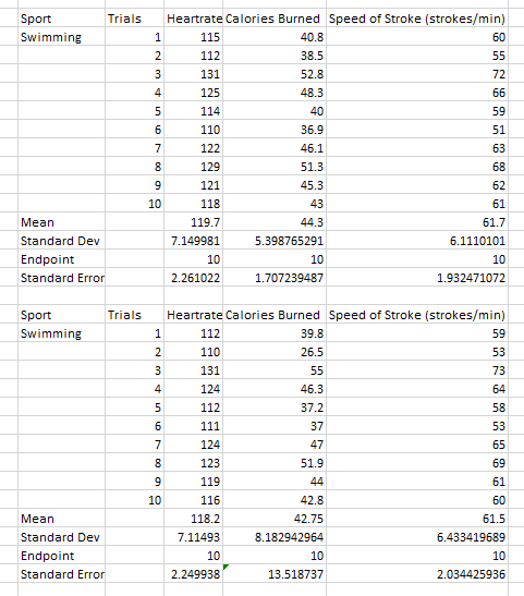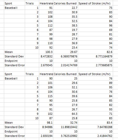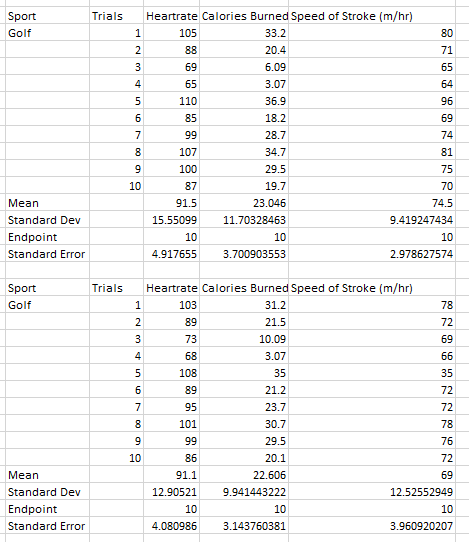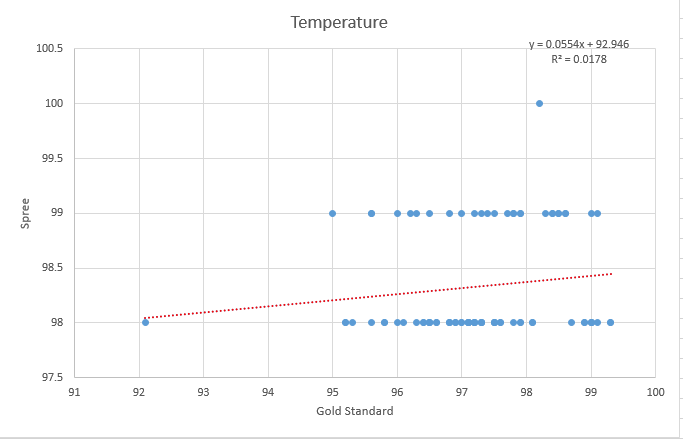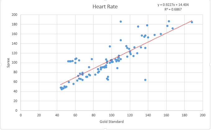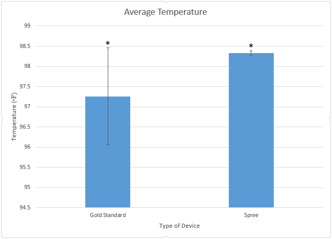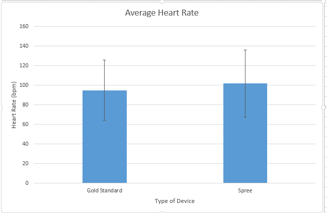 AnalysisA paired t-test was used to compare the data because the data was measured using two devices. A paired t-test made it easiest to compare the data side by side and see the correlation. Heart Rate P-value attained from t-test: .121 Pearson's R: .829 Temperature P-value attained from t-test: 6.11 E-13 Pearson's R: .133 With a p-value of .121 for the heart rate, the data is not statistically significant because .121 is greater than .05. Because the data is not statistically significant it can be concluded that the spree is not able to accurately measure heart rate. The value of .829 for the Pearson's R means that there is a strong positive correlation between the data sets of the spree and the gold standard. This is because the value .829 is positive and close to 1. With a p-value of 6.11 E-13 for the temperature, the data is statistically significant because 6.11 E-13 is much less than .05. Because the data is statistically significant, it can be concluded that the spree is capable of accurately measuring temperature. The value of .133 attained for the Pearson's R means that there is a weak positive correlation between the data sets of the spree and the gold standard. This is because the value of .133 is positive and not close to the value of 1.