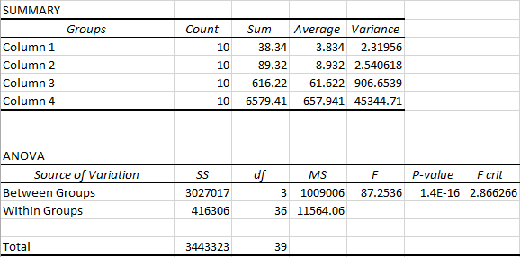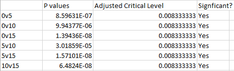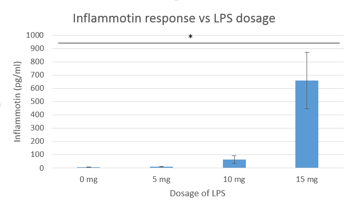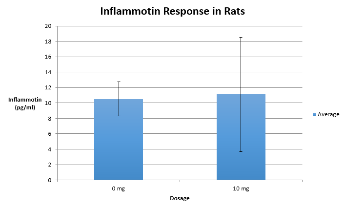 AnalysisExperiment 2 Rats Accepted P-value: p<0.5 No significant difference was shown between the two groups. Summary/DiscussionIn experiment one we see a significant increase in inflammotin production as the dosage of LPS increased. We can argue this by looking at the ANOVA test performed for the human data and seeing that the p-value found showed significant differences between the groups. The ANOVA test was performed because there were more than two groups that needed to be compared. The p-values found by the ANOVA test were significant according to the Bonferroni Correction that required p-values to be less than 0.008333. In the second experiment we see that the rats allow for a more precise and accurate measurement of their inflammotin production levels to be taken. Yet there were only two groups of data, zero and ten milligrams of LPS, to be compared for the rats. The t-test performed on the rat data showed a p-value of 0.867. Since the p-value is above 0.5, this meant that there is no significant difference between the two groups and that increased LPS dosage did not cause increased inflammotin levels for rats. However, it is important to consider that there was only a total of ten rat subjects as opposed to the larger sample size of forty human subjects. In order to increase the variance and possibly see a better change in inflammotin for the rats, more subjects are needed for experimentation. We were able to see a significant increase in inflammotin production levels due to higher LPS dosages only in humans. |