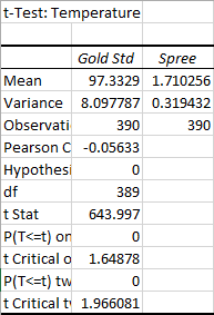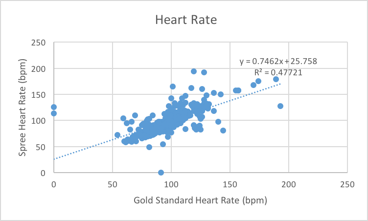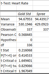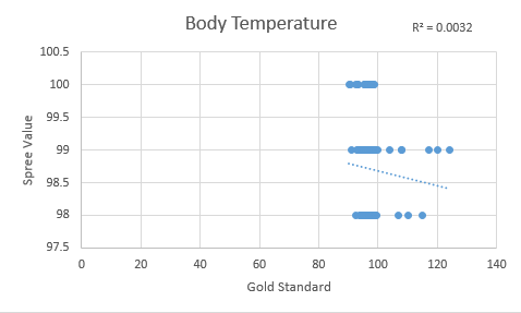 AnalysisWhen considering the temperature it is hard to compare a thermometer which can have so many different readings to the spree app which only has 4 different levels this explains why there is a p-value of zero . In that way it makes it hard to quantify statistically the relationship between the two. A normal persons temperature really only varies when they are sick or under extreme condition, as no one in the current study were under extreme physical duress one cannot deduce if the spree can accurately recognize an increased body temperature. The rest would seem pretty accurate but this could not be distinguished from the lack of variance in body temperature throughout the day and between individuals. The heart rate seems accurate when looking at the median but you see a much higher variance in the spree than the more accurate gold standard. There is a correlation but it is about .56 the more accurate the higher correlation so a r value closer to 1 would be preferred. The p-value is extremely high as well showing that the similarities are not significant and the spree not extremely accurate for heart rate.
