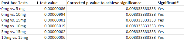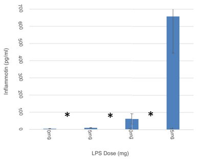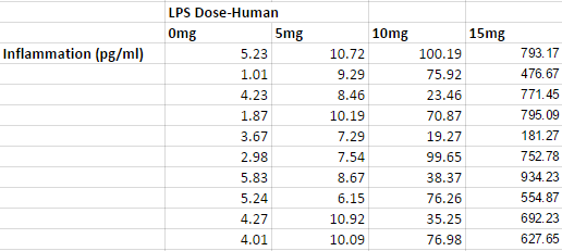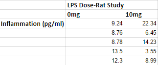 Summary/DiscussionData analysis results of this experiment showed that there was a significant difference in the effects of different dosages of LPS on inflammation in humans but not in rats. Our T-test p-values were less than .00833333 within the human groups proving that the comparisons are statistically significant, showing a correlation between LPS dosage and inflammation. However, in rats our T-test p-value was greater than .05 making the comparison insignificant and proving that the LPS dosage had no significant effect on inflammation in rats. | ||||||