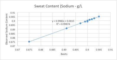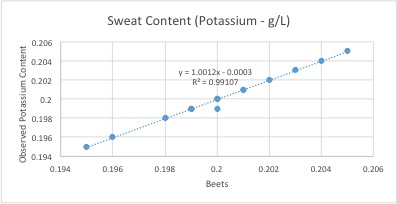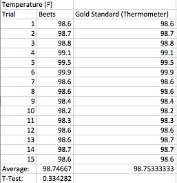 Also observed were exceptionally strong positive correlations between the values, all of them, when analyzed, producing an R2 value of 1. For example, the observed R2 value for the relationship between the temperature measurements taken form the Beets and that taken from the Gold Standard thermometer was 0.996643176641338.