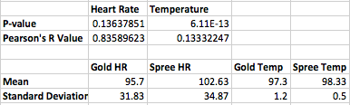 The observed Pearson's R Value for the relationship between the Spree's heart rate monitor and the Gold Standard monitor was 0.83589623, indicating a strong positive correlation between the two sets of values. The P-value for the same relationship was calculated as 0.13637851, far above the necessary threshold of disproving the null hypothesis, making the relationship statistically significant. Alternatively, Pearson's R Value for relationship between the temperature measurements of the two devices was 0.13332247, portraying a considerably weak correlation. Additionally, the P-value for the same relationship was 6.11*10^-13, indicating that there is only an infinitesimally small probability that the null hypothesis, that is that there is no correlation between the temperature readings from the Spree device and that of the thermometer. This was most likely caused by the fact that the Spree device assigned different temperature values to a set of four arbitrary levels. These relationships can be observed in the below graphs: in the "Heart Rate Comparison" graph, the error bars overlap each other almost completely, indicating statistical significance, while those in the "Temperature Comparison" graph only overlap for a comparatively small set of values.