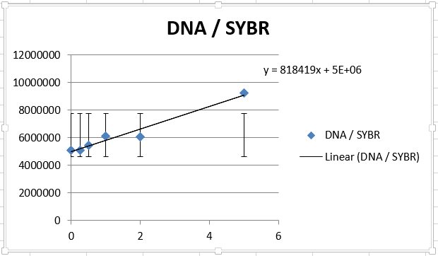 Patient 1 DNA was split up into three samples of varying concentrations where they were close to the negative control concentration. When the three droplets concluded in concentrations way below the positive control meaning that there was no diseased primer present in the droplet even with the mixture of 80 μL of SYBR Green 1. With the fluorescence test where it lit up as a dark blue as the fluorimeter's light was refracted among the primers resulting in perfect matches of the divided DNA during PCR. This mixture of DNA and SYBR Green undergoes PCR where human DNA is denatured and a healthy primer then binds to it during annealing process since the base nucleotides match each other and anneal together as base pairs. With this visual presentation is accurate to the quantitative data calculated in which patient #52130 has a nice amount of DNA by 80μL and that it didn't glow the green dye from SYBR which is an indicator of a diseased primer duplicated during PCR.Patient 52130 resulted in not having a diseased primer