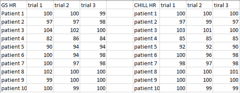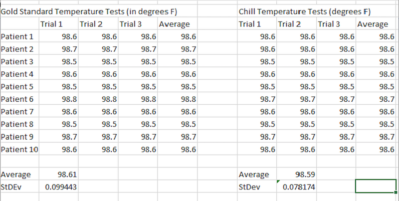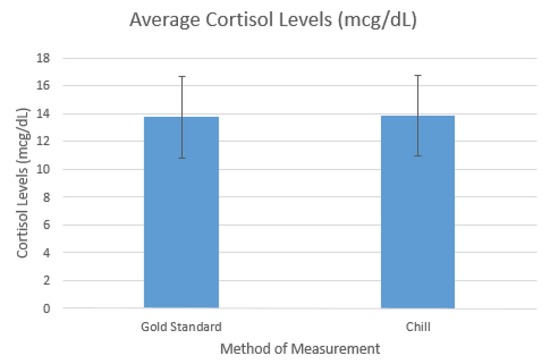Inferential StatisticsFor there to be a significant difference between two sets of data, the p-value found through a t-test must be less than 0.05. The p-value for the heart rate data was 0.79785. The p-value for cortisol levels was 0.57251. The p-value for the body temperature data was 0.16785. Since all of these p-values are greater than 0.05, there is no significant difference between the measurements from the gold standard and the Chill for heart rate, cortisol levels, or body temperature.