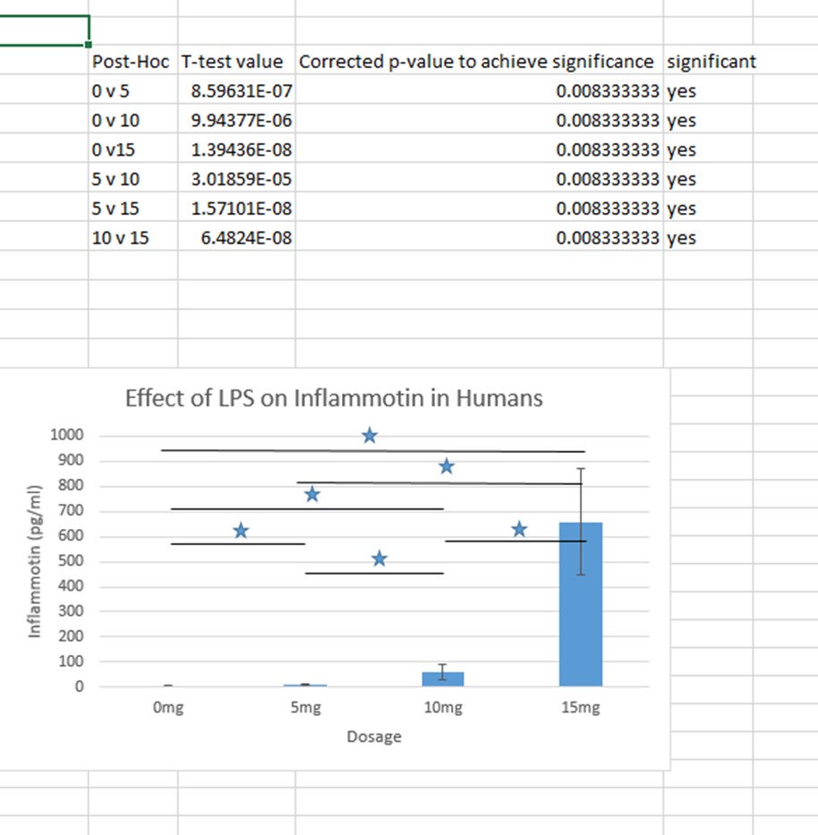 Summary/DiscussionWe did two experiments in order to investigate the effect of LPS to increase inflammotin on human. And one of the two we choose rat as object for a preclinical test. We only chose two groups of rats who are injected 0 mg and 10 respectively. according to the acquired data, the average of two groups' inflammation level are very close, but the 10mg group' SD is very high, after t-test, we found out that there isn't a statistically difference of the effect of different dose of LPS on rat. For the experiment on human, we had 4 groups given 0,5,10,15 mg LPS separately. The inflammotin level increased greatly with increased dose of LPS, and corresponding SD of each group also increase greatly. Through one-way ANOVA, we got very low p-value which prove the result is accurate and stable and that LPS can increase the inflammotin level in human body. Finally, we think the failure of LPS on rats and success on human may give might be contributed to the large number of objects and groups on human experiment, or it's because the difference between human and rat themselves that lead to opposite experiment results. | |||||||||||||||||||||||||||||||||||||||
