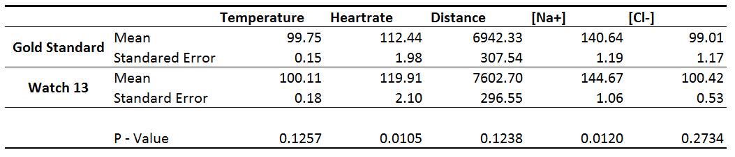 This allows for a comprehensive collection of fitness data. Also this design method keeps Watch 13's cost low, battery life long, and light weight. Inferential Statistics