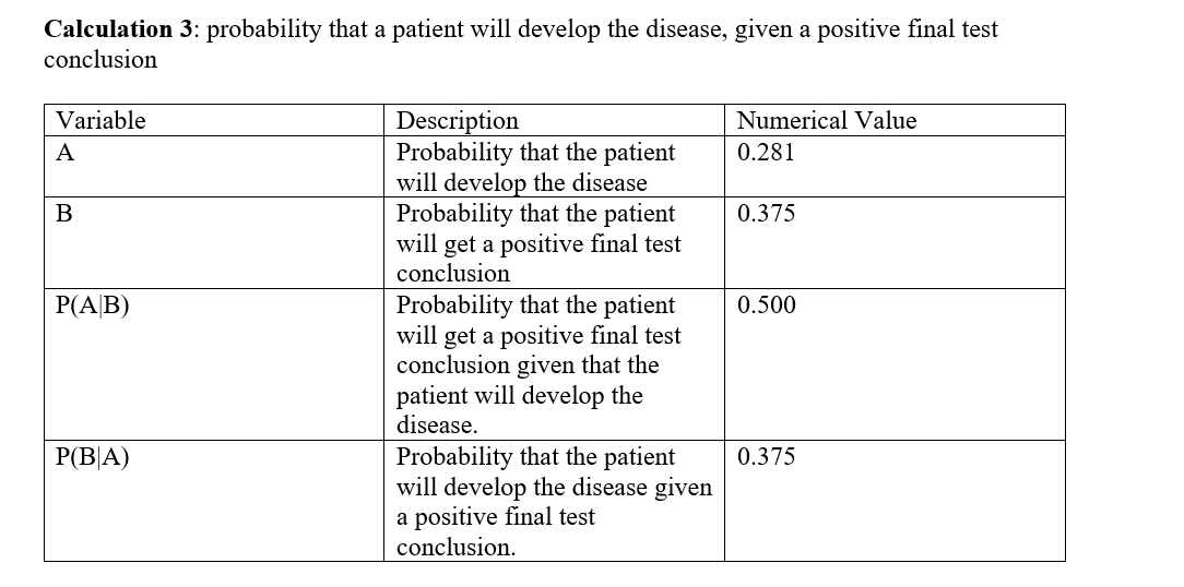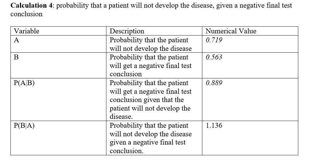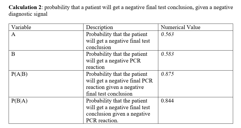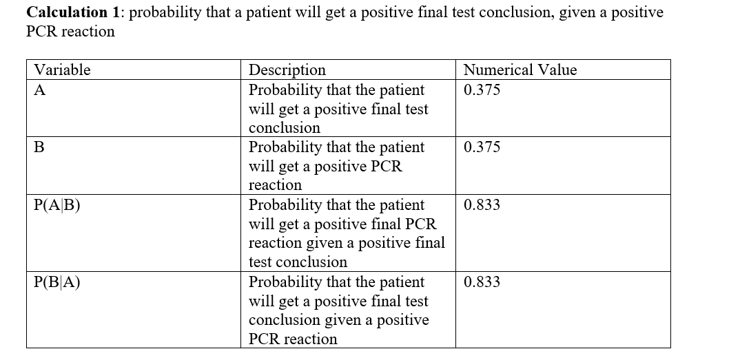 For calculation 3, the calculated probability that the patient will develop the disease was found to be very small, less than 30%. Further, the calculated probability that the patient will get a positive final test conclusion was found to be slightly higher, but still about to 40%. Using those probabilities, the probability that the patient will get a positive final test conclusion given that the patient will develop the disease was found to be exactly 50%, while the probability that the patient will develop the disease given a positive final test conclusion was found to be less than 50%. It can be included that using PCR final result in predicting the development of the disease For calculation 4, the calculated probability that the patient will not develop the disease was found to be very high, close to 70%, while the probability that the patient will get a negative final test conclusion was found to be slightly less than that, which was close to 50%. Given those probabilities, both the probability that the patient will get a negative final test conclusion given that the patient will not develop the disease, and the probability that the patient will not develop the disease given a negative final test conclusion were really high, close to 1.00. In conclusion, the positive PCR results are not reliable in predicting the development of the disease. However, the negative PCR results were very reliable in predicting the development of the disease with much greater accuracy.