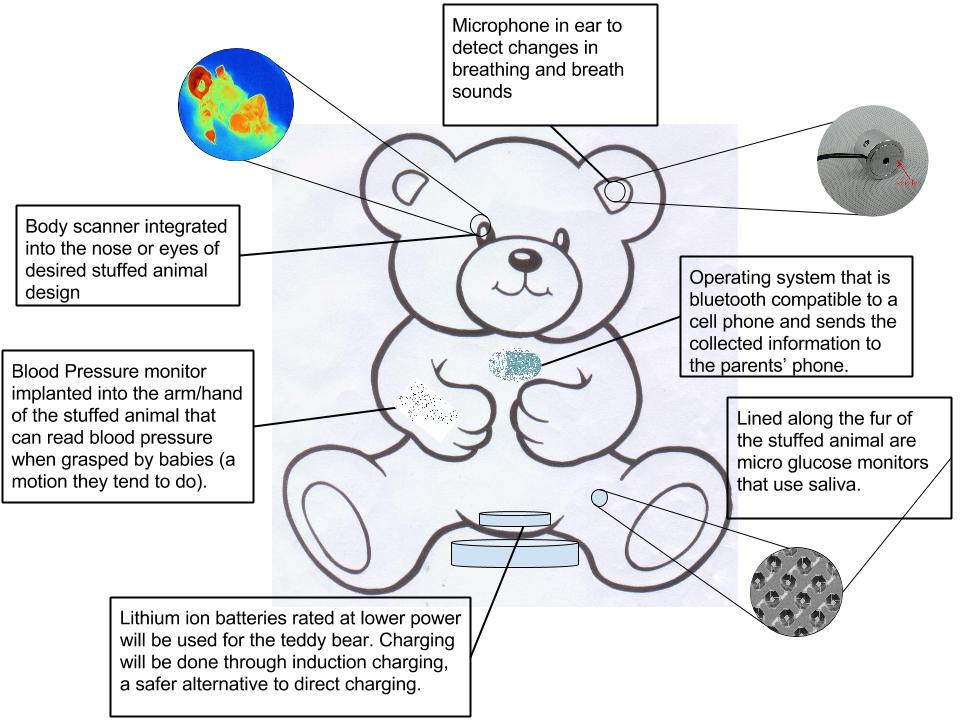 Device DesignTED (Technology Empowered Devices) is a customizable stuffed animal that monitors temperature, heart rate, blood pressure, respiratory rate, and glucose levels in babies. Information can be viewed by the parent on any smartphone. Device includes wireless charging. The device also communicates through bluetooth.