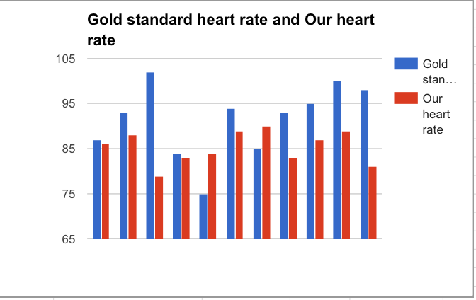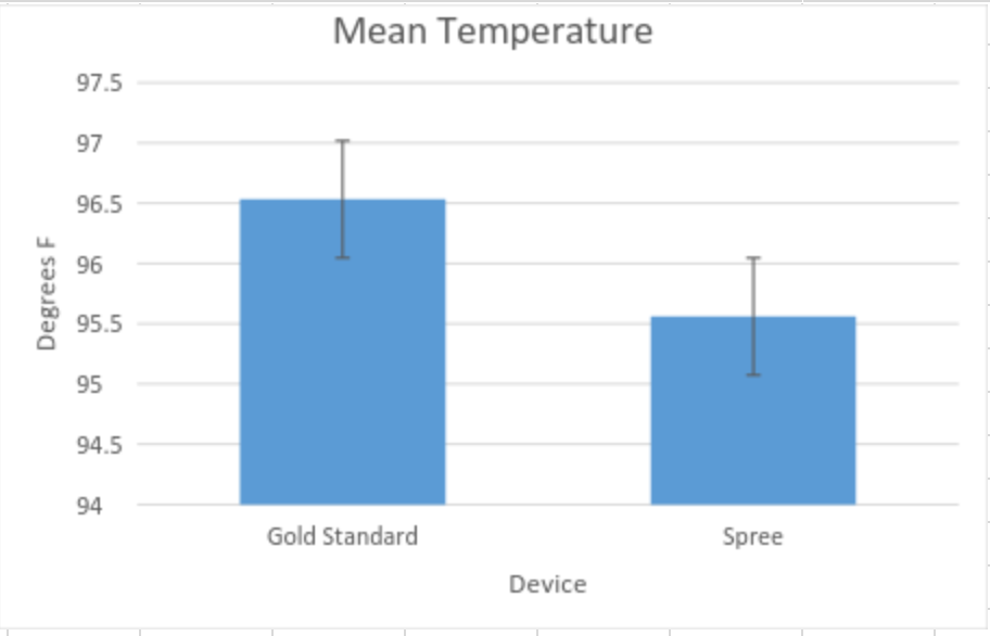 ResultsAnalysisBased off of the descriptive statistics for both heart rate and temperature it was found that the Spree Headband was relatively accurate, especially in terms of temperature where the standard deviation was only .88 °F. A deviation so low especially compared to the 2.05°F for the gold standard shows that the headband has a very high degree of accuracy. However in regards to heart rate the standard of deviation is actually higher than the gold standard at 25.05 bpm compared to the gold standard of 22.44 bpm. While both of which are relatively high standards of deviation, the spree headband has a larger value and thus a larger degree of inaccuracy.