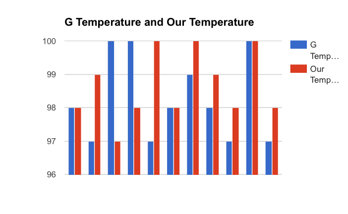 Inferential StatisticsHeart Rate: Gold Standard Average - 91.5 bpm -Standard Deviation: 7.99 TED's Average - 85.4 bpm -Standard Deviation: 3.61 Temperature: Gold Standard Average - 98.3 °F -Standard Deviation: 1.27 TED's Average - 98.6 °F -Standard Deviation: 1.03 Blood Pressure: Gold Standard Average - 120.5 mmHg -Standard Deviation: 25.8 TED's Average - 122 mmHg -Standard Deviation: 25.1 Blood Glucose Levels: Gold Standard Average - 136.4 mmol/L -Standard Deviation - 29.8 TED's Average - 128.7 mmol/L -Standard Deviation - 16.9 Respiratory Rate:
