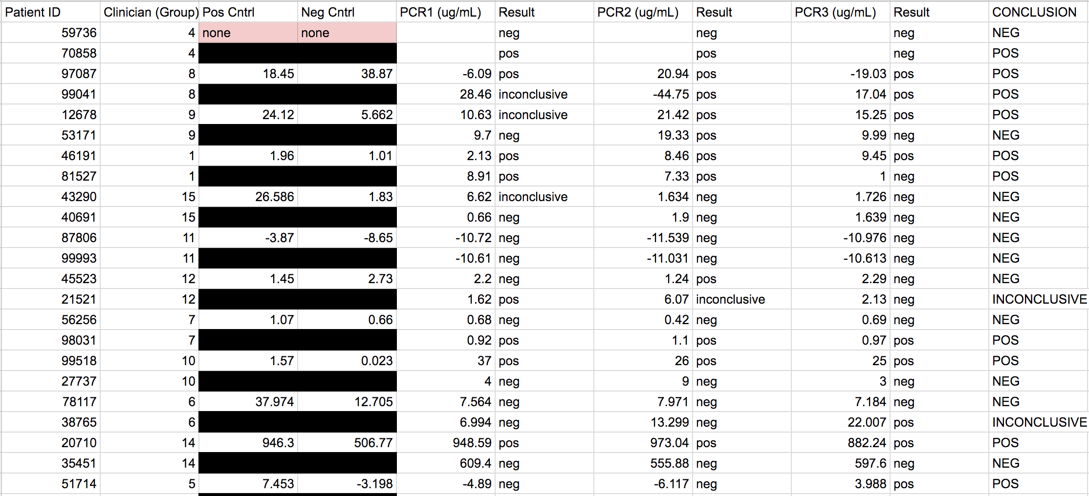 LAB 6 WRITE-UPBayesian StatisticsOverview of the Original Diagnosis System In BME 100, the process of polymerase chain reaction (PCR) was used to test the DNA of patients for the disease-associated SNP. The class was divided into 17 teams with 6 students each. Each group got 2 patients to diagnose leading to a total of 34 patients being tested. In order to prevent error or minimize the amount of error three replicates were created for each patient. Along with creation of multiple replicates, controls were put in place for the actual process of PCR and for the calibration in ImageJ. The control for PCR was a test tube which contained DNA from a person who definitely carried the SNP disease whereas the negative control was the DNA of a person who definitely did not carry the SNP disease. The patients tested had not yet been tested for the disease. For the ImageJ analysis of the pictures taken the positive control was 80 microliters of SYBER Green I - which glowed a fluorescent green whereas the negative control was 80 microliters of pure solution that did not glow at all. To make sure each trial was consistent with the previous trials a micropipette was used and a single 80 microliter drop was analyzed. The final data was as follows: