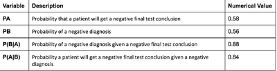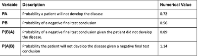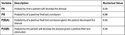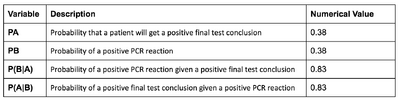 Calculation 3 asked us to find the probability that the patient will develop the disease given a positive final test conclusion. Our Bayes value came out to be low. Calculation 4 asks us to find the probability that the patient will not develop the disease given a negative final test conclusion. Our Bayes value came out extremely high, more than 100%. These two calculations imply that a positive PCR result was not reliable, while a negative PCR result is quite reliable in predicting the development of the disease.