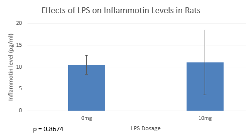 Summary/DiscussionIn the test on humans, the inferential statistics revealed a highly significant correlation between LPS dosage levels and inflammotin levels. However, the test on rats did not indicate any significant statistical difference. One factor which must be considered is the scope of the rat study, which was much smaller than that of the human study. It is also possible that the drug works differently in rats than in humans; however, more data would be required to reach such a conclusion. | |||||||