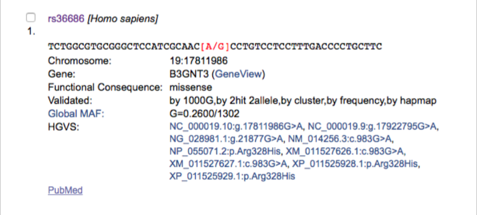 Research and DevelopmentPCR - The Underlying Technology Base-pairing SNP Information & Primer DesignBackground: About the Disease SNP Nucleotides are organic molecules that serve as subunits in DNA and RNA. They are composed of a base (adenine, thymine, guanine, or cytosine), a sugar molecule, and phosphoric acid. Polymorphism is the ability to process objects differently or redefine methods. Primer Design and Testing Part 1: The SNP rs36686 is found in Homo sapiens and is located on chromosome 19. Its clinical significance is listed as "NA". This SNP is attributed to immune and inflamation genes and risk of non-Hodgkin lymphoma. It is associated with the B3GNT3 gene. Below is a screenshot taken from the National Center for Biotechnology (NCBI) webpage on rs36686 SNP.