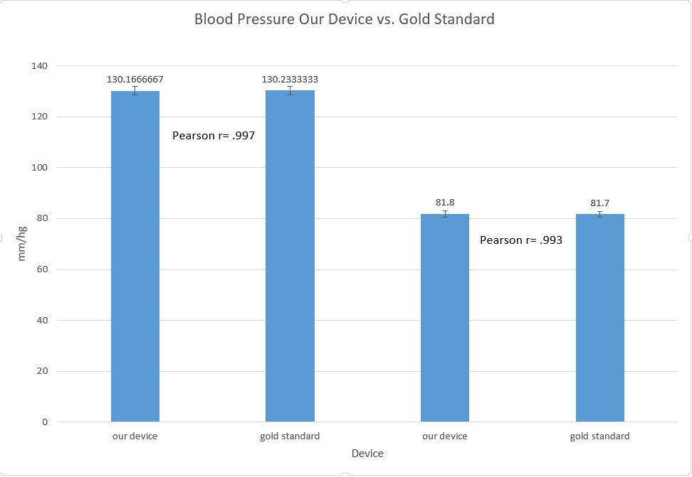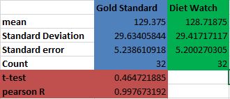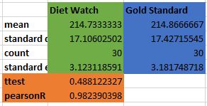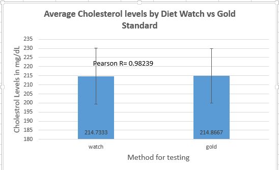 Inferential StatisticsBlood Pressure Diet Watch vs Gold Standard Systolic P Value = .978 Systolic Pearson R = .997 Diastolic P value = .951 Diastolic Pearson R = .993 Both the P value and Pearson coefficient show that there is a very strong, positive correlation between our Diet Watch and the Gold standard (a sphygmomanometer).