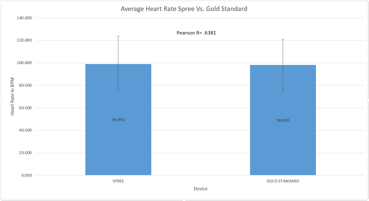 T test p value = .657460 Pearson Correlation = .63812443 With the p value from the T-test being greater than .05, there was no statistical significance between the gold standard and spree headband. The spree headband shows a moderate positive correlation with the gold standard in regards to heart rate. The Pearson correlation was greater than .5 but less than .7, so we can see that there was a moderate correlation but not a strong positive correlation, although the means were similar for the two devices.