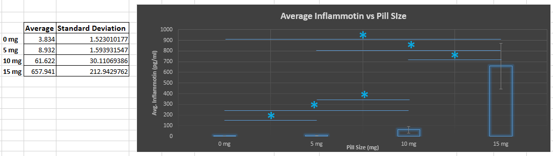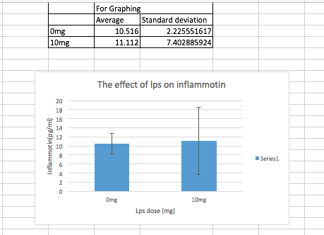 Summary/DiscussionThe p-value for the rat experiment was 0.867403497, which is above .05. Therefore, the rat experiment was not statistically significant and it did not matter whether Lps was given to the rat. The p-value for humans was .0125 which is lower than .05. Therefore the human experiment was statistically significant, meaning the Lps did increase inflammotin levels. |