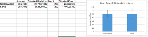 The statistical analysis of the two trials results shown on the graphs demonstrate that there isn't a significant difference between using a spree sensor and using an oral thermometer with the pulse ox (gold standard) on the heart rates measurements. This proves that the device is capable of giving an accurate and fiable value. The problem is that there is a significant difference between the temperature measurements, there is about 1.1 degrees of range of error. With this information the conclusion can be reached that the spree device is reliable when it comes to measuring the heart rate, but not the body temperature. This could be because it is a measurement done in the superficial part of the skin that is not as reliable as doing it in the inside part of the body. It has a higher percent error than the regular oral thermometer. This device is very useful on the heart rate measurement but is not recommended to measure body temperature.
