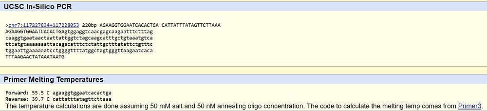 The primer test was performed by finding the nucleotide containing the CTFR variation of the primer, modifying it, and entering into the database containing other primers. The non-diseased primer had a match, since it is in the database. There was no match for the diseased primer.