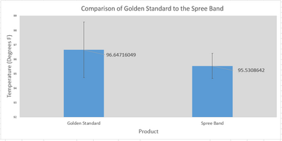 After looking at the results, we can conclude that the Spree Band is not as good as the gold standard for measuring heart rate (pulse ox) and temperature (oral thermometer) because of the large statistical difference between the band and the gold standard. The results of the paired T-test were 0.43 for the heart rate measurement and essentially 0 for the measurement of temperature. Both of these values are too small, so we have to conclude there is a statistical difference between the Spree Band and the gold standards.
