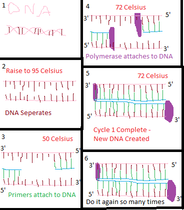 Heated Lid: 100°C (or 212°F) Research and DevelopmentPCR - The Underlying Technology The template DNA is the start point of the PCR process, it is what you are attempting to replicate, and is the base of the process. The primers are added, and are used to choose the specific area of DNA you are attempting to replicate. They target specific areas on the DNA, and attach to these areas to act as starting points for the replication. The DNA polymerase is then added; this is what actually builds the replicated strands of DNA by reading the DNA and attaching the appropriate nucleotides in the appropriate order. The dNTP’s are what actually make up the new DNA strand - these are the building blocks of DNA - adenine, guanine, cytosine, and thymine, and are matched by the polymerase to the original DNA strand to mirror the DNA. The initial step, raising the temperature to 95℃ for 3 minutes serves to separate the DNA double helix. This is known as denture and creates two single-strand DNA codes over 30 seconds. After this, the temperature is lowered to 57℃ for 30 seconds which allows the primers to sneak in between the DNA strands and lock onto the target areas. This is the anneal. The temperature is then raised to 72℃ (extend) for 30 seconds which allows the polymerase to lock onto the primers and begin creation of the new, replicated strand of DNA. The temperature remains here for 3 minutes which then allows the polymerase to do its’ work of creating the new DNA strands. The temperature is then held at 4℃ for extraction and preservation of the new DNA During this process, the adenine anneals to thymine and the cytosine anneals to guanine. The base-pairing itself occurs during the annealing phase, when the primer first locks onto the target section that matches the nucleotides it holds. It also occurs during the final extension phase where the polymerase creates a new strand of DNA by base-pairing the DNA strand it is attached to.