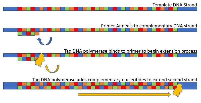 Research and DevelopmentPCR - The Underlying Technology Components of a PCR reaction A PCR reaction begins with a template DNA used as a base for creating the complementary base pairing strand. Primers are what binds to the template strand to bracket the target sequence to start replication. Afterwards, a taq polymerase attaches to the primer and assembles nucleotides into a new DNA strand. Deoxyribonucleotides (dNTP's) are the complementary nucleotides added to extend the second strand of DNA. Steps of Thermal Cycling The changes in temperature allows for the PCR reaction to occur. The initial step of increasing the temperature to 95 degrees Celsius for 3 minutes heats up the DNA and the strand begins to unwind. Afterwards, denaturing occurs, where the DNA separates into a single strand when the temperature is at 95 degrees for 30 seconds. At the anneal stage where the temperature is at 57 degrees for 30 seconds, primers bind to complementary DNA sequences. The temperature is then raised again to 72 degrees for 30 seconds for Taq DNA polymerase to bind to the primers for extension. Finally, at 72 degrees for 3 minutes, dNTP's are added to extend the second strand of DNA. Base-pairing There are four types of nucleotides that make up DNA. These nucleotides are Adenine (A), Thymine (T), Cytosine (C), and Guanine (G). Hydrogen bonding binds these nucleotides to create base-pairing. Nucleotides A and T binds together and C and G nucleotides bind together. Base-pairing occurs during the annealing and extension steps of thermal cycling. During Annealing DNA is bonded with the DNA primers as a starting position for replication. Temperature is then slightly elevated as the thermal cycling stage of extension occurs. Here, two taq polymerase come and match with the base pairs.