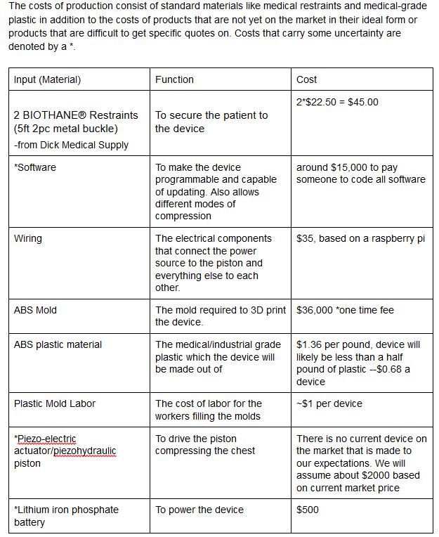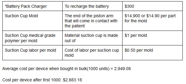 Fundability DiscussionReasoning for Scores *as compiled from lab1 and lab2 Customer Validation There are many customers who are willing to use this product, however; it depends on the end cost if it would get widely adopted, and the size of the device. This product could be extremely valuable, especially considering the large increase in survivability of cardiovascular failure when similar devices are used. Competitors There is a healthy market for automatic chest compression devices, however; many are lacking certain features, and are far too expensive to be a viable option for the public. This means there could be a large opening in the market for cheaper devices. IP Position The IP position of this product would be about a two. There are various patents describing other chest compression devices, but none of them have some of the exact features our device will have. In addition, most of the very similar patents are pending. For example, we plan on attaching the device to a stretcher or board to reduce bulk. Market Size As of 2011, the Journal of Emergency Medical Services estimated the number of EMS certified vehicles to be 78,258. So by a conservative estimate our market size is $5000*78258 = $391,290,000. Putting the score at a 2. However, if we were to assume only 5% market penetration then this conservative estimate would only yield a market size of $19,564,500. Technical Feasibility The proposed device receives a score of 2 for technical feasibility. Although there are a few hurdles involved in incorporating a piezo-hydraulic piston that is composed of a piezo-electric actuator and hydraulics fluid, the component is nothing but a piston on the base level. Furthermore, both the actuator and compact battery are not revolutionary devices that have hardly been researched. There are many companies such as Kinetic Ceramics investing in piezo-actuators and battery companies are always seeking ways to make their products more compact. The heavy part of research would fall upon industry whereas we would only have to experiment with the implementation of the device. Clinical Feasibility The proposed device receives a score of 2 for clinical feasibility. Although the benefit of ACCDs have sometimes experienced dubious results in certain studies, all of the major competitors in the market found success through clinical trials. There is a well documented history of ACCDs finding positive results in clinical trials. Although success is likely, clinical trials will require special expertise in the form of EMS technicians. Overall Fundability Our device should at least have the potential to be funded based of the fundability chart scores. Of the six categories assessed, it scored decently with 2 for each one. Furthermore, our product may be able to revitalize the ACCD industry because of the services it offers at such a competitive price. In addition, it can be manufactured via 3D printing molds and easily manufactured. The ease of production in combination with the profit gained from sales also support the assessment that our device is fundable. The only circumstances under which this device would not be fundable are if we truly do get only 5% market penetration with the conservative estimate of the number of EMS vehicles 6 years ago.
