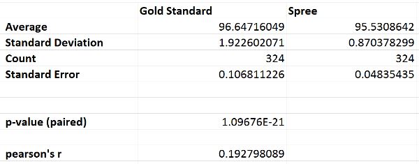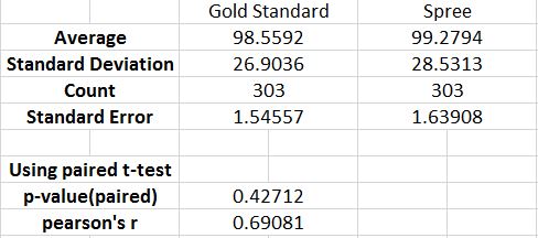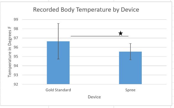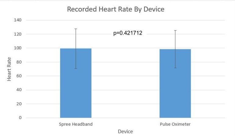 Inferential StatsT-test(paired) Is there a statistically significant difference between recorded heart rates? Since p-value = 0.421712 > 0.05 there is not a statistically significant difference between the recorded heart rates of the Spree Headband and the Pulse Oximeter. T-test(paired) Is there a statistically significant difference between recorded temperatures? The paired t test of the gold standard thermometer and the Spree headband yielded a p value of 1.09676E-21. Since this value is less than 0.05, there is a statistically significant difference in the temperatures measured between the Spree Headband and the gold standard thermometer.
