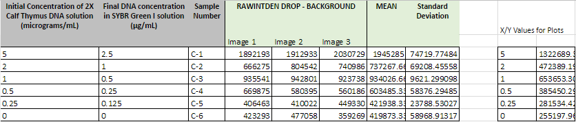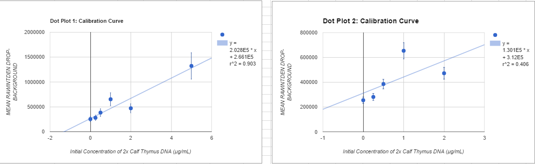 First, the fluorimeter was turned on, and using gloves, the slide was placed into the fluorimeter smooth side down. Then, the cell phone was placed in the cradle, and the fluorimeter was set up on top of tip containers so that the cell phone that was used could reach the top of the fluorimeter to get a camera view of the slide's edge. 80 uL of SYBR Green I and 80uL of the calibration solution were then placed in between the first two dots of the slide, and the light was adjusted to illuminate the center of the drop. The camera was then adjusted to be about 4 centimeters away from the fluorimeter. Then, the black cover was placed around the fluorimeter to make sure that the fluorimeter was protected from light, and the camera was adjusted one last time to make sure that the drop was focused. A 3 second timer was then set up on the camera to take 3 images once set off, the timer was depressed, then the flap on the cover was lowered before the picture was taken. The cover was then taken off, and the the 160 uL of the liquid was discarded into the waste container. The slide was then adjusted to the net row of dots, for the next samples to be placed onto the slide. Repeat above for all calibration solutions.