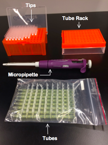 Our product will also come with a consumables package that includes a micropipette, tips, tubes, a tube rack, PCR mix in separate vials, and primers in separate vials. These items have been deemed the most important consumables. It is expected that the client will provide other supplies including lab coats, gloves, and goggles. Our consumables package differs from the lab because it will all be included in one package, rather than individually acquired. We have not made major changes to our Open PCR machine, and the changes we did make to the Fluorimeter did not affect the individual products in our consumables package. Below is a sample of the products that will be included in our device, excluding the PCR mix and primers, which are not shown.