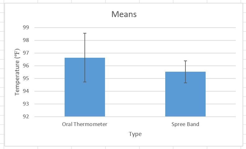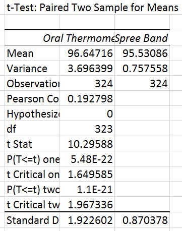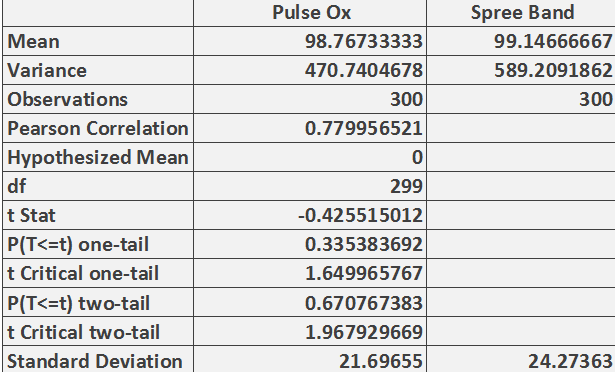 Inferential StatsWhen performing statistical tests in scientific experiments, there are two main tests that researchers primarily use--the t-test and the analysis of variance test.  Summary of ResultsFor both of the t-tests performed between the Spree headband and the pulse oximeter/oral thermometer, the degrees of freedom between the two was around 300. The critical T-value corresponding to 300 degrees of freedom and a p-value of 0.05 (5%) comes to 1.96 [2]. If the critical T-value calculated from the experimental data is less than the table's value, then one can conclude that there is no significant difference between the two test groups. If the critical T-value calculated is greater than the table's value, then one can conclude that there is significant statistical difference between the two test groups.