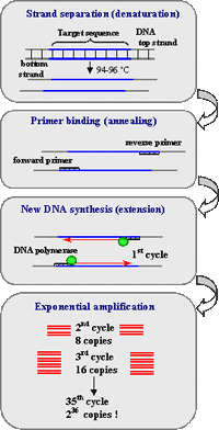 Research and DevelopmentPCR - The Underlying Technology Component functions of the PCR reactionA template DNA strand is used as a model for the newly synthesized strand of DNA. It contains the genes that are to be copied into the new strand. DNA primers are used to indicate the starting point of DNA replication. The Taq polymerase enzyme will recognize and bind to primers on the template DNA strand and then begin replication. The enzyme Taq polymerase binds to the primed sequences of DNA and adds nucleotides to extend the second strand. The deoxyribonucleotides are the monomers of a DNA strand, containing a nitrogenous base, deoxyribose sugar and a phosphate group. Taq polymerase synthesizes these nucleotides to grow the replicated DNA strand. The deoxyribonucleotides bind to each other through complementary base pairing. What happens to the components (listed above) during each step of thermal cycling?The first step of PCR is applying heat and raising the temperature to 95°C for 3 minutes. This simply heats up the solution. During the second step, or denaturing at 95°C for 30 seconds, the strands of the template DNA split up. The third step is lowering the temperature to 57°C for 30 seconds, which allows the primers to bind to the complimentary target sequence. The next step is to raise the temperature slightly to 72°C for 30 seconds, which is when the taq polymerase attaches to the primers. The last step is to hold the 72°C for 3 minutes, which is when the taq polymerase arranges nucleotides to make a new DNA sequence. The final hold at 4°C stops the reaction until the next run. Which DNA base pair anneals to each baseThere are four nucleotides, and they are thymine, adenine, guanine, and cytosine, or T, A, G, and C, respectively. T and A correspond, and C and G correspond. So when the taq polymerase is making its way along a DNA strand replicating, it comes accross each of these nucleotides. Whent he polymerase reads a T, it places an A on the new strand. When it reads a C, it places a G on the new strand. When it reads an A, it places a T. And lastly, when it reads a G, it places a C. During which two steps of thermal cycling does base-pairing occur?Base-pairing occurs during the third and fourth steps of thermal cycling. It occurs initially when the Taq polymerase enzyme adds DNA nucleotides to the replicated strand after it has bonded to the primer sequence of DNA. Base-pairing then continues to occur when the PCR cycle is repeated through 35 cycles, creating billions of replicated DNA strands. Image source: https://www.ncbi.nlm.nih.gov/probe/docs/techpcr/ SNP Information & Primer DesignBackground: About the Disease SNP SNPs are single nucleotide pairs that are unique for each individual. These differences in the DNA strands are only one nucleotide different than everyone else but they are undetectable by the naked eye. These changes alter how humans react to drugs and the strength of their reaction. Primer Design and Testing