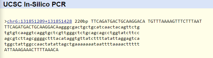 Disease reverse primer: 5' TGT TTA AAA GTT TCT TTA AT 3' The primer test demonstrated that the primers were located on the correct chromosome and in the correct location. The non disease primers were located on chromosome 6, 220 base pairs apart. This is the correct distance because the forward primer and reverse primer were separated by 200 base pairs, and were 20 base pairs long. The disease primers were not recorded to exist in the human genome. This makes sense because those primers were the result of the SNP mutation. | |||||||||||||||||||||||||||||||