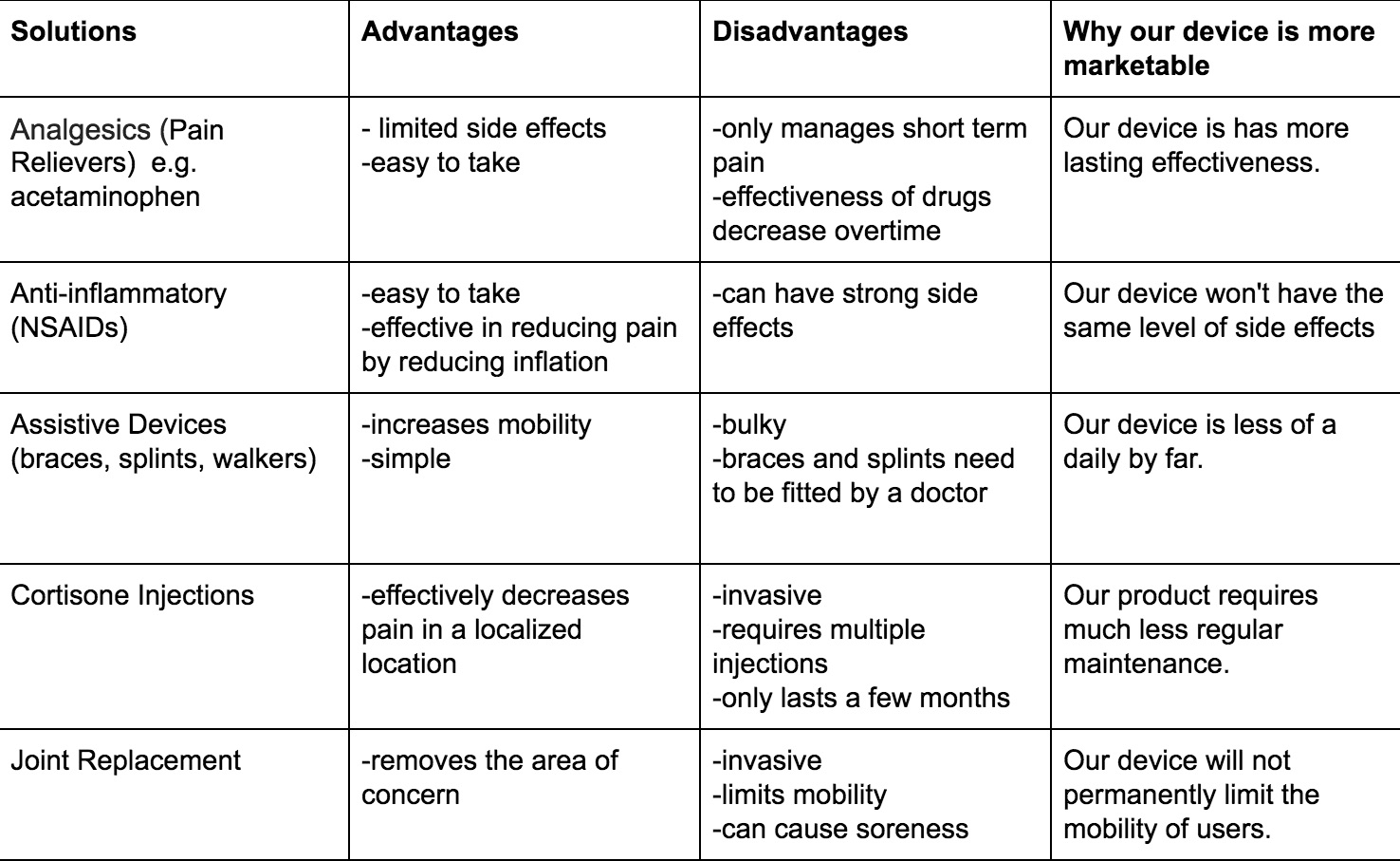 OUR TEAMLAB 1 Needs IdentificationHealth Care IssueThe health care issue we are focusing on is Osteoarthritis, which is also called the “degenerative joint disease” and occurs when the cartilage or cushion between joints begin to wear away leading to swelling and or stiffness (1). Osteoarthritis can target any joint in the body, but it is most commonly found in the joints of the knees, hands, hips, and spine. Patients often suffer from joint tenderness, and a loss of flexibility -a lack of a full range of motion in joint. This is due to the deterioration of the slick cartilage, and a combination of an inflamed synovial membrane, and a reduced joint space. If the cartilage is completely destroyed, one may be left with bone rubbing on bone. Current medical treatments include acetaminophen, nonsteroidal anti-inflammatory drugs (NSAIDs) , and or duloxetine - commonly used as an antidepressant (1). These are only meant to relieve the pain the patient would experience. The current surgical procedures that treat Osteoarthritis are comparatively invasive, and include among cortisone injections, realignment of the bones, and joint replacements (1). Impact of Issue on Society Solution Our solution would be a neural implant that would send electrical stimulations to the vagus nerve, and block the production of inflammatory proteins such as tumor necrosis factor (TNF) and prostaglandins that result in pain, warmth, and swelling. The implant would respond to a biological marker of arthritis, cartilage oligomeric matrix protein (COMP) in the bloodstream, and would release stimulation accordingly. By regulating the release of these proteins in a routine-like manner, the immune system could be regulated, and the patient could experience a reduction in pain during therapy or recovery.