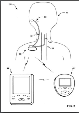IP PositionPatent 1: Prescription Pad for Treatment of Inflammatory Disorders Prescription pad for treatment of inflammatory disorders, ZITNIK, Mar 3, 2011. The following is a patent for a cuff that goes around the vagus nerve that is surgically implanted in the patient. Once it has healed it sends information wirelessly to an electronic tablet that can keep track of the status of the implant as well as control the stimulation of the cuff. The prescription pad is then charge by a traditional charging module. The amount of stimulation will be entirely controlled by the doctor who will have access to input “prescriptions” into the pad. The doctor will get information from biomarkers in the patient and will use that information to determine the dose; therefore, the actual patient will not be able to accidentally over or under treat themselves.The controller would control the intensity of the stimulation the patient would receive. This device is designed to be mainly used for inflammatory disorders. Patent 2: Implantable Therapeutic Systems Including Neurostimulation Circuits, Devices, Systems and Methods Implantable Therapeutic Systems Including Neurostimulation Circuits, Devices, Systems and Methods, Scott Armstrong et. al, Nov 26 2011. This patent consists of two neurostimulation devices that will be connected and an array of neurostimulators that are controlled by an external controller. It is connected by the external device with an electrode on each end of the device. The neurostimulators contain non-volatile memory and respond to communications using identification codes. A polymer connector is attached to the first implantable stimulator which would form a neurostimulator array. Functions are performed by integrated circuits which have an input current rating from about zero to about five milliamps. The external controller (the control system) receives communications from the internal device, and allows the internal device to proceed with its function; Therefore, the external control system is composed of software and hardware that allows the control function. There are several different models for the process of stimulation including coils. This device does not target any specific disease and is simply a design for a nerve stimulation device and therefore is a very broad therapy.