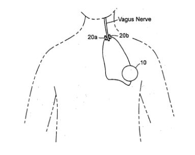 Treating inflammatory disorders by electrical vagus nerve stimulation, Jared Huston and Kevin Tracey, Aug 10, 2006. This patent includes a device to stimulate the vagus nerve using voltage to treat the inflammatory cytokine cascade. A teflon-coated silver electrode .003 inch in diameter is wrapped around the nerve. Stimulation is performed using the STMISOC stimulation adapter (a Biopac system). This device is designed to be used on an array of conditions, but focuses on the anti-inflammatory potential of nerve stimulation. The vagus nerve is stimulated by a signal voltage from 0,01 Volt to 1 Volt. However, this device is not effective if the patient suffers from asthma or cystic fibrosis. The half-life of TNF suppression by electrical vagus nerve stimulation was between two and three days, which is long-lasting compared to the pharmaceutical alternatives.The device can be implanted onto any surface of a nerve that branches off the main vagus nerve, and can be used to target a variety of inflammatory diseases. Patent 4:
