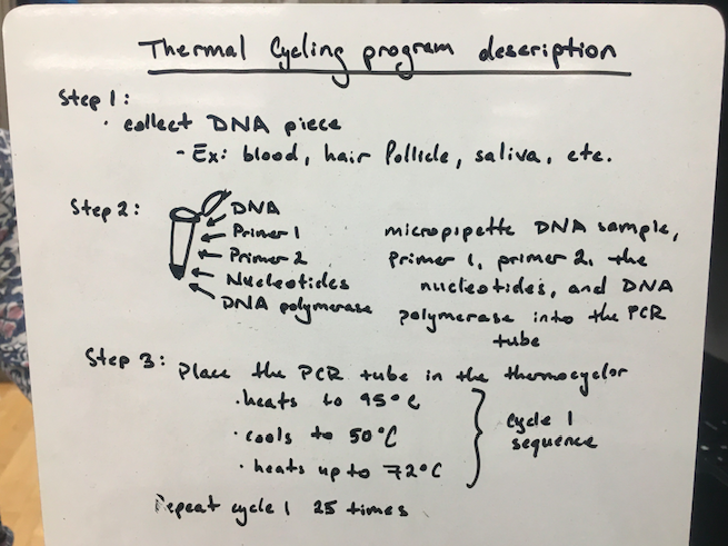 Research and DevelopmentPCR - The Underlying Technology There are four main components of a PCR reaction, which are Template DNA, Primers, Taq Polymerase, and Deoxyribonucleotides (dNTPs). Template DNA is a sample of DNA used to copy multiples of it. The function of primers are to attach to sites on DNA to the DNA strands that are at either end of the segment one would want to copy. The function of Taq Polymerase is to read the DNA and attach matching nucleotides to create DNA copies. And deoxyribonucleotides (dNTPs) are the building blocks that link to form a strand of DNA. Thermal cycling is a process in which involves all of the above components. During the initial step, the DNA double helix structure unwinds. Then the DNA splits into 2 single stranded DNA molecules, which is during the denature step at 95 degrees for 30 seconds. Then, Extend at 72 degrees for 30 seconds is where the DNA polymerase binds to the primer and then adds complementary DNA nucleotides to the template strand until polymerase reaches the end and falls off. Then in the final step, the prior 3 steps are repeated to create new cycles and to make additional new DNA strands and cycles that come afterwards will strictly only have the desired DNA fragments. In the final hold, DNA rewinds back to original double helix structure. DNA is made up of four nucleotides, which are Adenine (A), Thymine (T), Cystosine (C), and Guanine (G). The first step is during Anneal because the temperature is cool enough that nucleic acids can pair with each other but 57 degrees favors the primers to bind to the template strand of DNA and add the first few base-pairs before each template strand can bind with each other again. Next is Extend at 72 degrees because that this point the temperature is more favorable for base pairing so DNA polymerase binds to the primer and then adds complementary bases to the template strand until completion.