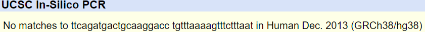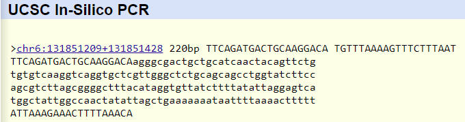 Disease reverse primer (20nt): 5' TGT TTA AAA GTT TCT TTA AT 3' The primer test showed that the primers were located on chromosome 6 and were 220 base pairs apart, which is what was found in the primer design as they were found 200 base pairs apart and were both 20 bases long. The disease primers display no match in the results, which makes sense due to those primers not intended to be found along the human genome as it is a part of the SNP mutation.