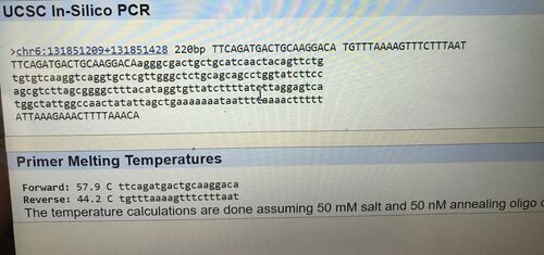 The primer test for the non-disease forward and reverse primers was successful because the result from the USCS In-Silico PCR web-page gave a 220 bh sequence from the chromosome. The SNP was positioned at 131,851,228 and 200 base pairs to the right of the disease SNP was 131,851,428. The non-disease forward primer was recorded to be TTCAGATGACTGCAAGGACA and the non-disease reverse was TGTTTAAAAGTTTCTTTAAT. When the disease forward and reverse primers were inputted into the web-page, it resulted in no matches. The disease forward primer was the same as the non-disease forward primer, but the last base was changed to be identical to the disease SNP nucleotide (from A to C).The disease reverse primer was kept the same as the non-disease reverse primer. The reason the disease forward and reverse primers resulted in no matches is because it is not the healthy primer, so it will show up as no matches because it is different from the healthy primer. Sources