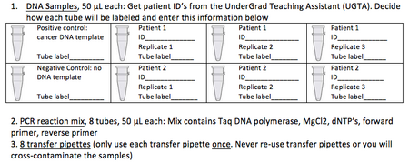 Week 2: DNA Amplification Reactions, 10/24/12Students used their experience from the previous week to set up and run a PCR experiment. The students were provided with personal protective equipment, 8 tubes of 50 μL PCR reaction mix, 8 tubes of 50 μL diluted template + primers, and disposable transfer pipettes. The instructors provided positive and negative "patient" samples so that some samples would test positive for a DNA marker (produce amplification), and others would test negative (no amplification). Experimental protocol planners set up and ran the PCR reactions. These were set aside to run for ~2 hours.
