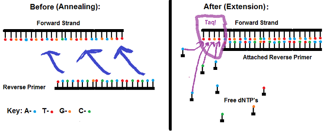 When attempting to replicate DNA during PCR, two primers are required in order to facilitate extension of both the forward and reverse DNA strands. As mentioned above, the reverse primer for the cancer associated sequence would be , having the mutated C instead of the T. A forward primer is also required in order to facilitate extension of the reverse strand. It is usually around 200 base pairs from the mutated DNA sequence and is also 20 base pairs long. For this strand of DNA, a suitable forward primer would be: . With these two primers in place, Taq polymerase can properly do its job by attaching free dNTP’s to the forward and reverse DNA strands during the extension phase of PCR. An illustration of this concept is shown below:
