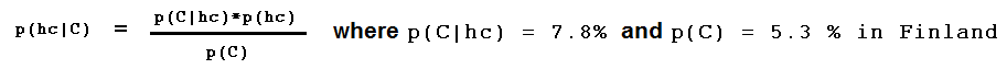 An important part of any test is its reliability. If a test or diagnostic does not have a level of reliability, it will be ineffective in identifying populations that pass or fail the test. To measure the reliability a diagnostic will have on a certain population, a theorem known as Bayes Rule is utilized. This equation calculates the probability that A will be true given B. For example, A = hc = people who have cancer in a population while B = C = people in the population who have the rs17879961 SNP; therefore Bayes’ Rule would provide the probability that people who have cancer in population will ALSO have the rs17879961 mutation [p(hc|C)]. In this case, the percentage of people who possess the mutation and have cancer is known [p(C|hc)] along with the percentage of people with the mutation in the population of Finland [p(C)]. Therefore, the only percentage that would need to be found would be the percentage of people who have cancer in Finland [p(hc)] for Bayes’ Rule to work. This example of Bayes’ Rule is illustrated below: