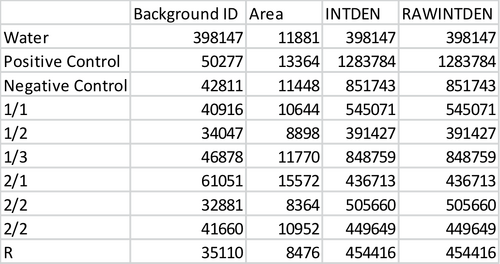 DNA μg/mL = The DNA Concentration was calculated by the formula: 2*(INTDEN sample with subtracted background)/(INTDEN of Calf Thymus with subtracted background). In which INTDEN refers to the Integrated Density of each picture sample. This formula works because there was a calibration factor (2) which is a known value for the control.
