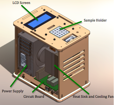 When the Liquid Crystal Display (LCD) screen is disconnected from the open PCR circuit board, the LCD screen is shut off. The circuit board provides the power and the input signals for the LCD screen. Therefore, when the two parts are not connected, the LCD screen will not function. When the 16-tube PCR block is disconnected from the PCR circuit board the block will not heat or cool. The fan and lid heater are both connected to the PCR circuit board with wires, so if this connection is disrupted, those parts will not function.