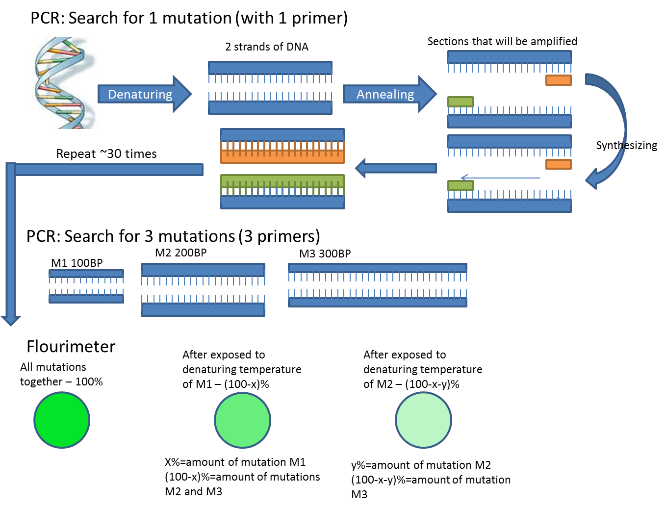 Theory behind the process: when each mutation (m1, m2, and m3) are amplified, the length of the strands of the amplified DNA will be different depending on which mutation was amplified. For example, if M1 is amplified, the DNA strands will be relatively short (100bp), if M2 is amplified, the DNA strands will be 200bp, and if M3 is amplified, the DNA strands will be 300bp. The shorter DNA strands are more unstable and will denature at lower temperatures. If we begin with a green concentration that is 100%, then test samples that have been denatured at each of the various temperatures, the loss of concentration of the green will be the amount of that mutation present in the whole sample.