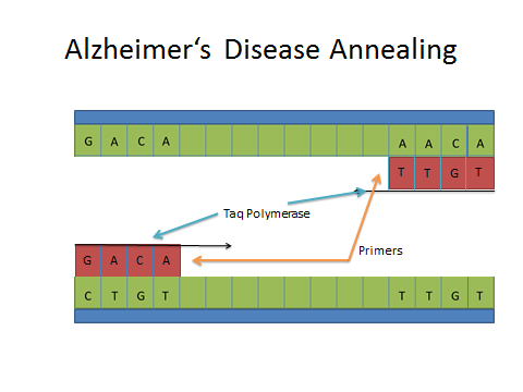 Other common variances of AD occur in rs429358 and rs7412 (which involve changes in C and T), but the primer and sequence is only needed for rs17517621. As discussed in the last lab, a diseased allele will give a positive result in the PCR because only this specific primer can bind to that specific DNA sequence. So if the disease is present, the primer will bind and replicate the DNA exponentially, resulting in a positive. If the disease is not present, on the other hand, the primer will have no chance to bind, thus giving a negative result.